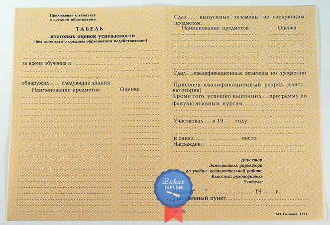 • аттестаты советского образца, отличающиеся нанесенным на листе справа гербом РСФСР, которые получали ученики, закончившие школу до 1993 года;